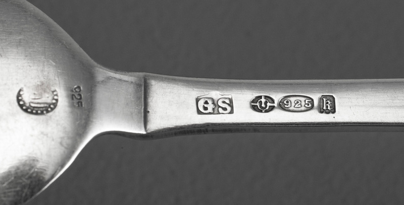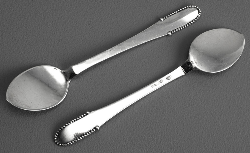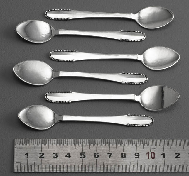 Description: A rare set of Georg Jensen Beaded pattern ice cream (or sorbet) spoons (6), made in very limited quantities. The spoons are small teaspoon size, and have flat oval bowls for eating ice cream, the bowls are planished (hand beaten marks, hand forged). The beaded pattern (Kugle in Danish, Jensen pattern # 7) has a beaded pattern around the lower edge of the handle, it was designed by Jensen himself in 1916, described as "an elegant composition, that remains contemporary in design while imparting a timeless quality" - Georg Jensen, Tradition of Splendid Silver, page 267. All 6 spoons are hallmarked with Danish marks GJ in circular bead with 925 standard mark, and English import marks for 1925, with importers mark GS for George Stockwell & Co, (imported Jensen silver between 1909 and 1931).