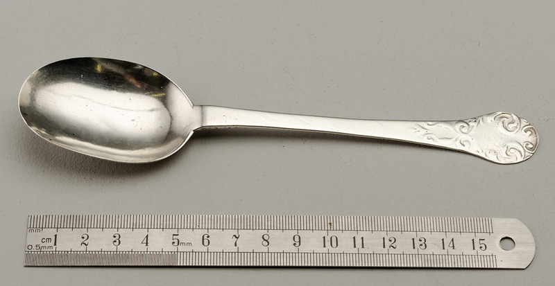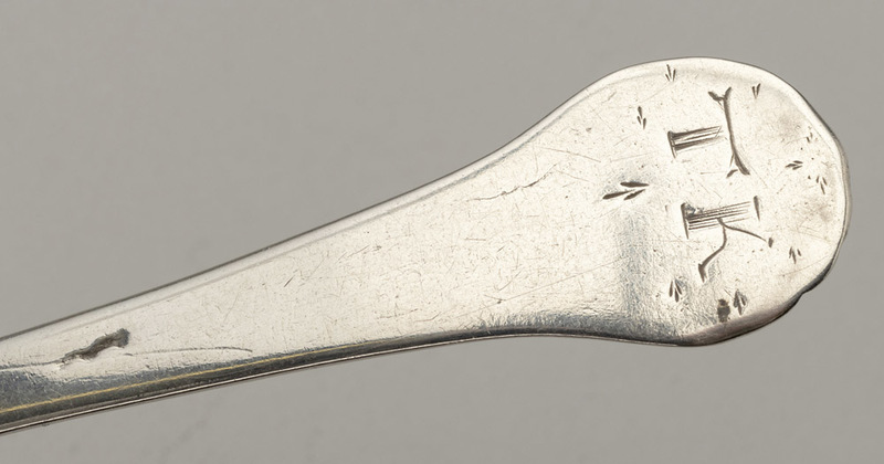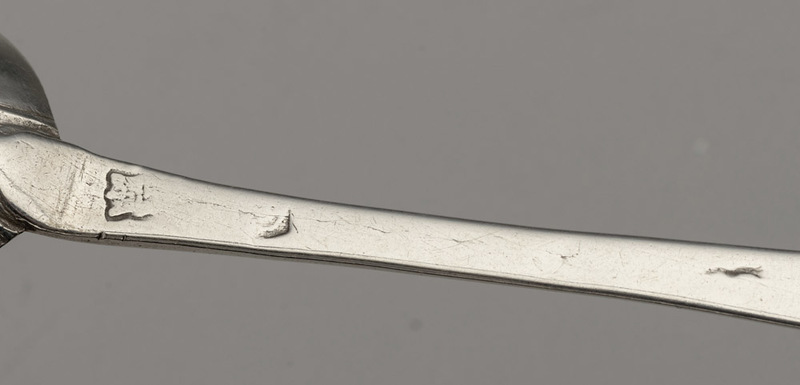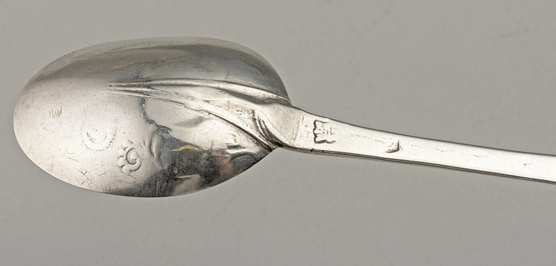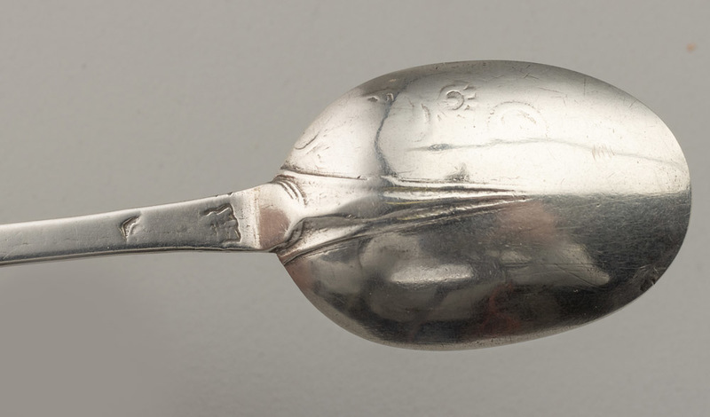Description: A very worn late 17th century Lace Back Trefid spoon, of interest as is has some very rare features, so despite the poor condition of the spoon we have added it to our website. The spoon has a rounded terminal with no ears, sometimes called a spatula end, this is a feature of early Scottish trefid spoons, hence our tentative description as Scottish. The spoon has a reeded rat tail, the lace decoration on the front of the terminal is worn but distinct, the lace decoration on the back of the bowl is very worn, almost gone on one side of the bowl, with some features faintly visible on the other side. The spoon is engraved on the back with owners initials TK surrounded by arrows, this engraving is lovely. The front has another very faint set of scratched initials CS, also with arrow, only visible in strong light. The spoon has 3 partially struck or worn hallmarks, the first a crown above (leopard head?), the second possibly a date letter (C?), the third is just a squiggle. The book "Silver Spoons of Britain 1200-1710" by David Constable (a book we highly recommend), volume 2 has 3 notable comparisons. The first, a Scottish Lace Back Trefid from Aberdeen circa 1695 (no. 212, page 924), has similar rounded terminal with no ears, also note the lace back decoration on the front terminal is very similar in design. The second, from the range of lace back bowls, the closest we can find is item 7.111, page 602, bowl type C, London 1882 by Edward Hulse, note the similarity in the scroll centre edge, but still different from all the illustrated examples. The third, a description of Spatula or round end, page 562, noting it as a specialty of Edward Sweet of Dunster, but a very small number known from Scotland. Note - A Scottish spatula end spoon, dated 1707, with a normal rat tail and without lace back decoration, featured in the Finial Auction of January 2023, lot 120.