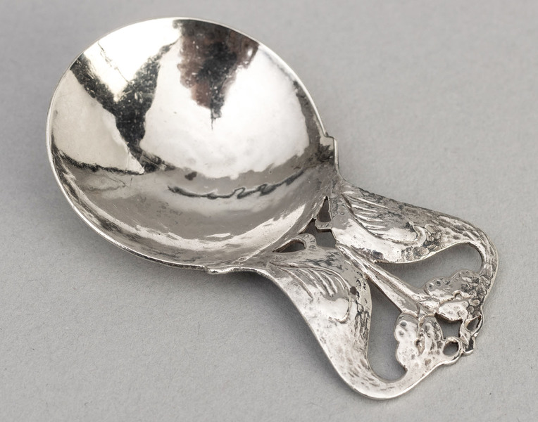 Description: A rare and beautiful Arts & Crafts cast silver caddy spoon by Bernard Instone, featuring 2 Great Crested Grebes in a courting ritual. The caddy spoon has a circular planished (hand hammered) bowl, the handle is pierced and engraved to produce the birds embracing along their beaks. This caddy spoon has been previously described as depicting 2 stylized storks, but we are confident it represents the elaborate mating ritual of the Greater Crested Grebe, as confirmed by the KSIA (Keswick School of Industrial Arts) website. The spoon has excellent hallmarks, including makers mark B.I in oval punch for Bernard Instone. Instone (1891-1987) registered his mark in 1922, he studied under Arthur Gaskin and worked for John Paul Cooper. He established Langstone Silver Works in Digbeth, Birmingham in 1919, after 4 years service in the Great War. He was subcontracted to produce silver for Sibyl Dunlop (with her SD makers mark), and also produced silver for Liberty's (source Simon Moore Artists Spoons, page 411). Bernard Instone also produced an Apple tree caddy spoon, which seems to have survived in greater numbers than this crested grebe example.