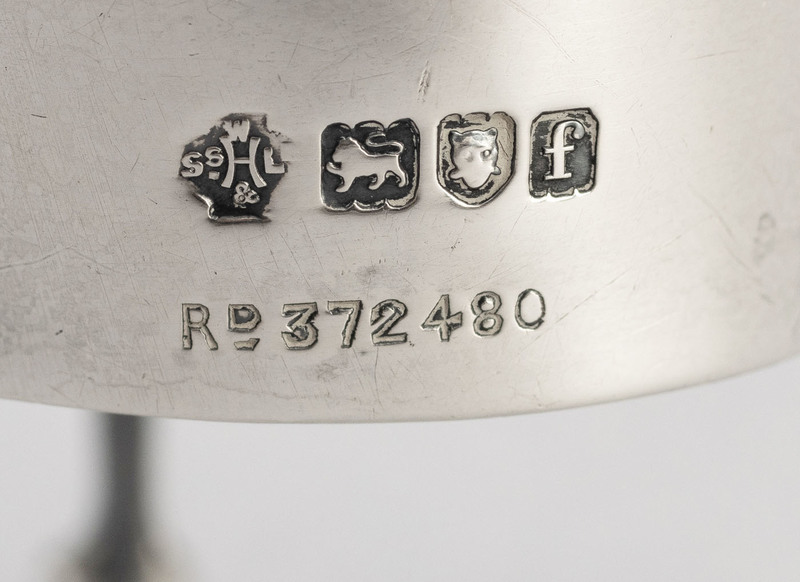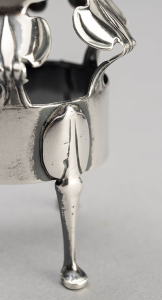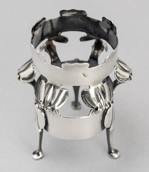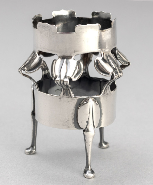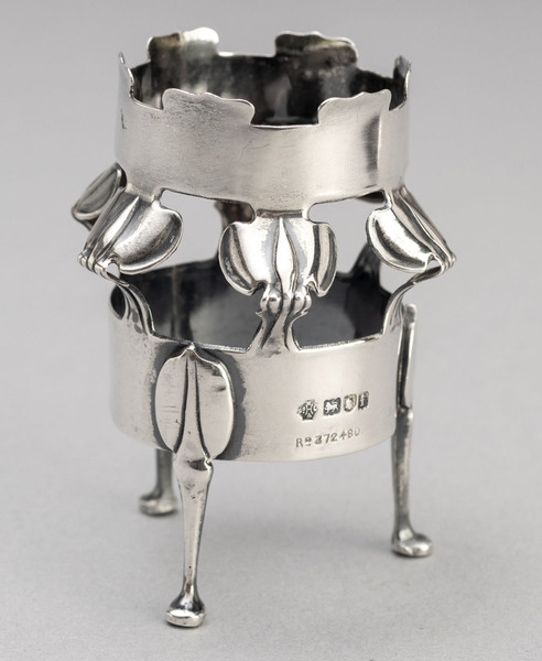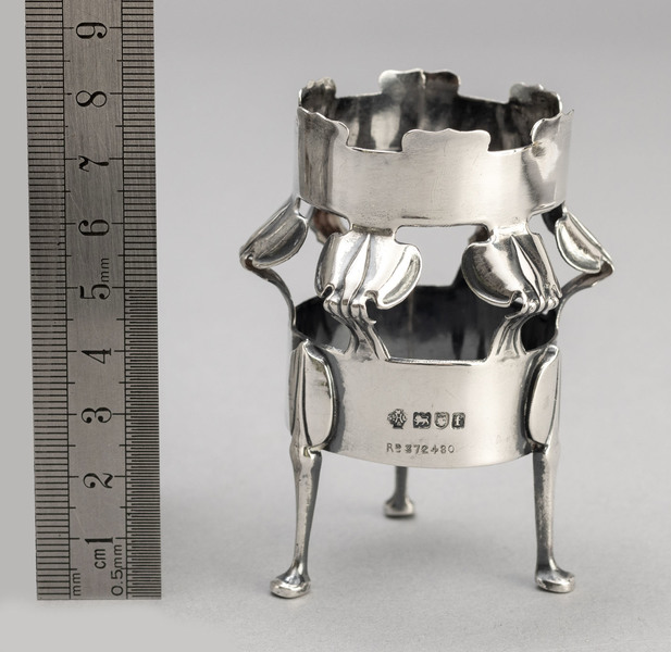Description: An Arts & Crafts silver vase stand, made by William Hutton & Sons in 1901, and designed by Kate Harris. The vase holder is cylindrical, with six stylised flower heads angled out of the cylinder, and 3 long pad feet with stylised leaf, and crenulated top. This would have originally contained a Powell green glass vase, unfortunately now missing. The vase is clearly hallmarked with makera mark and London 1901 hallmarks, above registration design mark "Rd 372480". "Kate Harris was Hutton’s leading designer c 1898-1904, based in their London studio, and is famous for her distinctive British art nouveau style". - Source Peartree Collection, which we highly recommend. A complete version of this vase can be seen on the Style Gallery website www.styleantiques.co.uk.