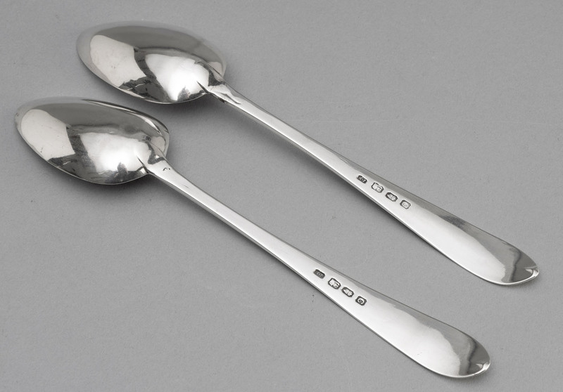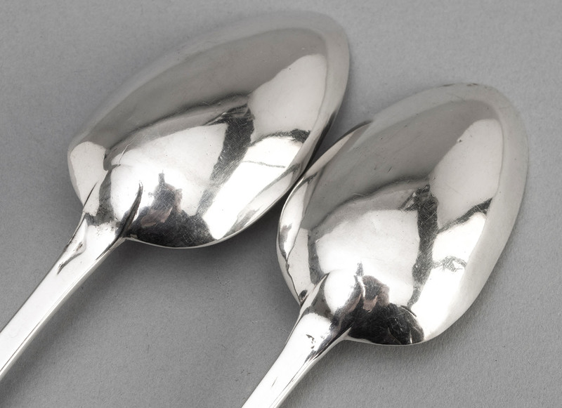 Price: $ 700.00 Weight: 155 grams Dimensions: 25.6 cm Condition: Fair to good, these spoons have been used. Strong tips to the bowls, but one bowl has a 2 cm split to the bowl which has an old repair, with solder marks still visible. Some small dents and 2 small kinks to bowl edge, but overall suitable for use.