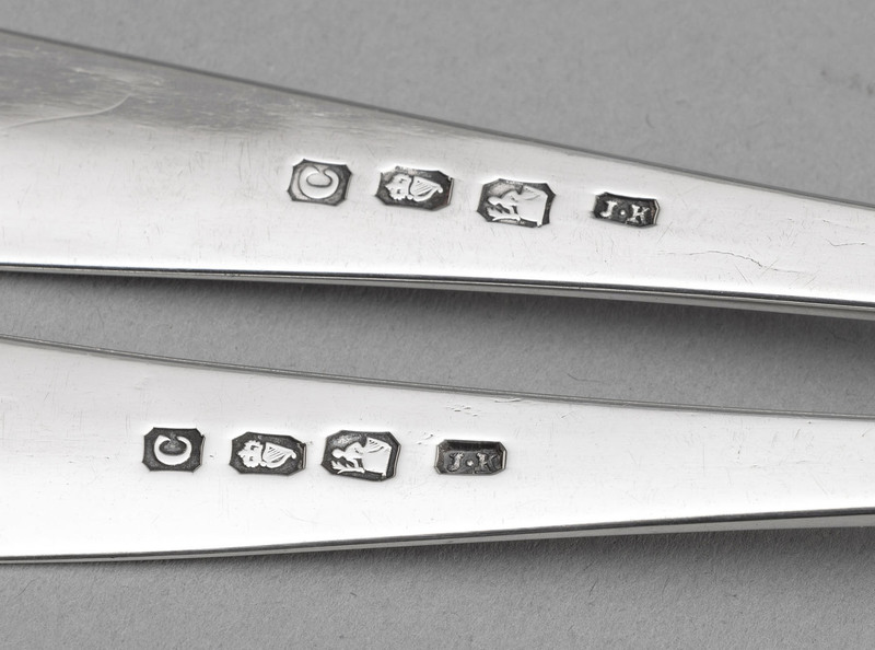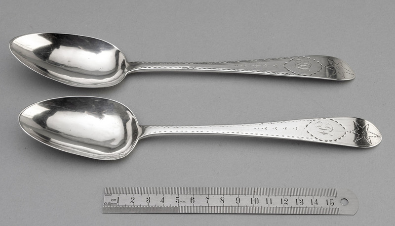 Description: A pair of Irish Georgian silver Bright Cut Celtic Point pattern serving spoons, with the traditional Dublin Star above the cartouche with engraved owners initials JT. The engraved stars have 6 points, and were clearly engraved by hand, as you can see differences between the engraving on the 2 spoons. The hallmarks are clear on both spoons, including makers mark J.K for John Keene I, who worked between 1784 and 1807. He was clearly a respected silversmith, he was elected Warden 1797-1799, Master 1801-1802, and was also on the Dublin City Council 1798-1801.