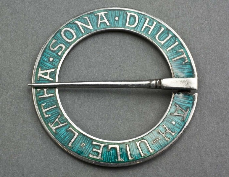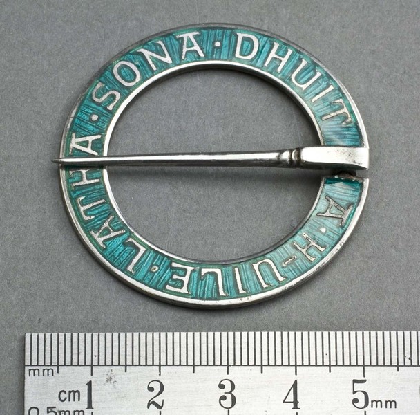 Description: A rare silver and green enamel annular brooch designed by Alexander Ritchie, the famous Iona silversmith. The brooch has a Gaelic inscription "A h-uile latha sona dhuit", translated "May all your days be happy". These brooches are traditional wedding presents to celebrate a marriage. The Alexander Ritchie website (see our links page) shows 2 similar brooches, one in blue and the other in red enamel, both are described as rare, they do not show a green enamel example. Ritchie began to use the Birmingham assay office in 1931, and he had close links to the Birmingham firm of Darby & Sons, who made items for him. After Ritchie's death in 1941, some of his original moulds were used by Darby until the 1950's, this is one of these (see Ritchie website). The hallmarks are small but visible, the pin is also hallmarked.
