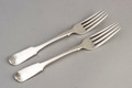 A pair of Irish Georgian silver tableforks in the Fiddle pattern, made in Dublin in 1825 by Thomas Farnell and retailed by Law, with an interesting hallmarking anomaly, showing 2 different date letters for the same year. The first fork has date letter capital E in oval punch, the second fork has date letter small e in shaped punch, this change took place mid way through the hallmarking year on 20 September 1825 (we are not sure why, all assistance welcome). Whilst both forks were made by the same maker in the same year, very small differences in shape and length of Fiddle can be observed, so these were made by hand. Both forks are engraved with a Griffins head family crest on the rear of the forks, this is crisply engraved and very clear. In addition, both forks have engraved letter T on the front of the forks at the bottom of the handles, we presume to denote a previous owner. Both forks are also stamped with retailers mark LAW, William Law were Dublin retailers in Castle and Sackville streets, they operated...