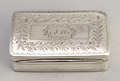 A Cape silver snuff box, decorated with typical Cape silver engraving, struck twice with an unidentified makers mark that requires further research. The snuff box is rectangular, with a plain thumb-piece and gilded interior. The box lid is beautifully engraved, original owners initials JM in script, surrounded by oval wreath. The wreath is repeated in rectangular form, with the typically Cape wavy engraved border repeated twice, on the border and around the wreath. Careful examination of the engraved wreath shows the wavy leaves and foliage branch off from the wavy engraved design. The base is engraved with the same wavy borders, with a central rectangular cross hatch design, this looks similar to engine turned engraving but was clearly done by hand. The sides of the snuffbox have engraved bands (a series of dots), this is also present on the base. Similar engraving on Cape silver snuff boxes can be seen in the book "Cape Silver" by Stephan Welz, page 88 figure 1 by Johannes Combrink, and page 89 figure 1. b...