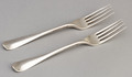 A pair of Dutch silver Hanoverian pattern tableforks, made in Rotterdam in 1781 by Rudolph Sondag, 'the most famous silversmith in Rotterdam, his work towered above the Rotterdam silver landscape" - source (Schadee, Zilverschatten, Drie Eeuwen Rotterdams Zilver). The forks are clearly hand made, and differ in weight - one is 82 grams, the other 77 grams. The forks have 4 tines, and are bottom marked with 4 clearly struck hallmarks - date letter Y for 1781 with a distinctive dot above one arm, Rotterdam town mark (slight wear at bottom), crowned rampant lion standard mark (934 grade so purer than sterling) and makers mark of sunburst sun in shield punch. Rudolph Sondag's makers mark usually has a face in the sun centre, this is worn on these forks. Sondag worked form 1746 until his death in 1812, he was highly productive and has left behind some magnificent silver, well represented in Rotterdam's Museum Boijmans van Beuningen. Aardewerk notes varied quality in the work he produced, and postulates he guarantee...